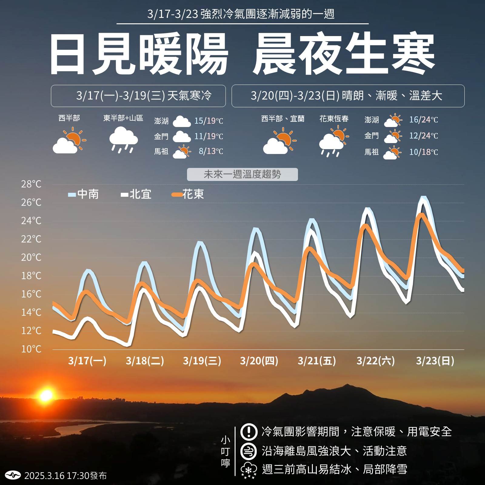 中央氣象署指出,明(18)日受強烈大陸冷氣團持續影響,各地早晚天氣寒冷,夜間清晨中部以北及宜蘭低溫只有11-12度,其他地區13-15度,空曠地區可能再低1-2度,請做好保暖工作。