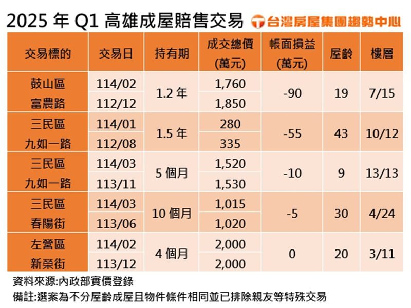 2025年Q1高雄成屋賠售交易。(台灣房屋提供)