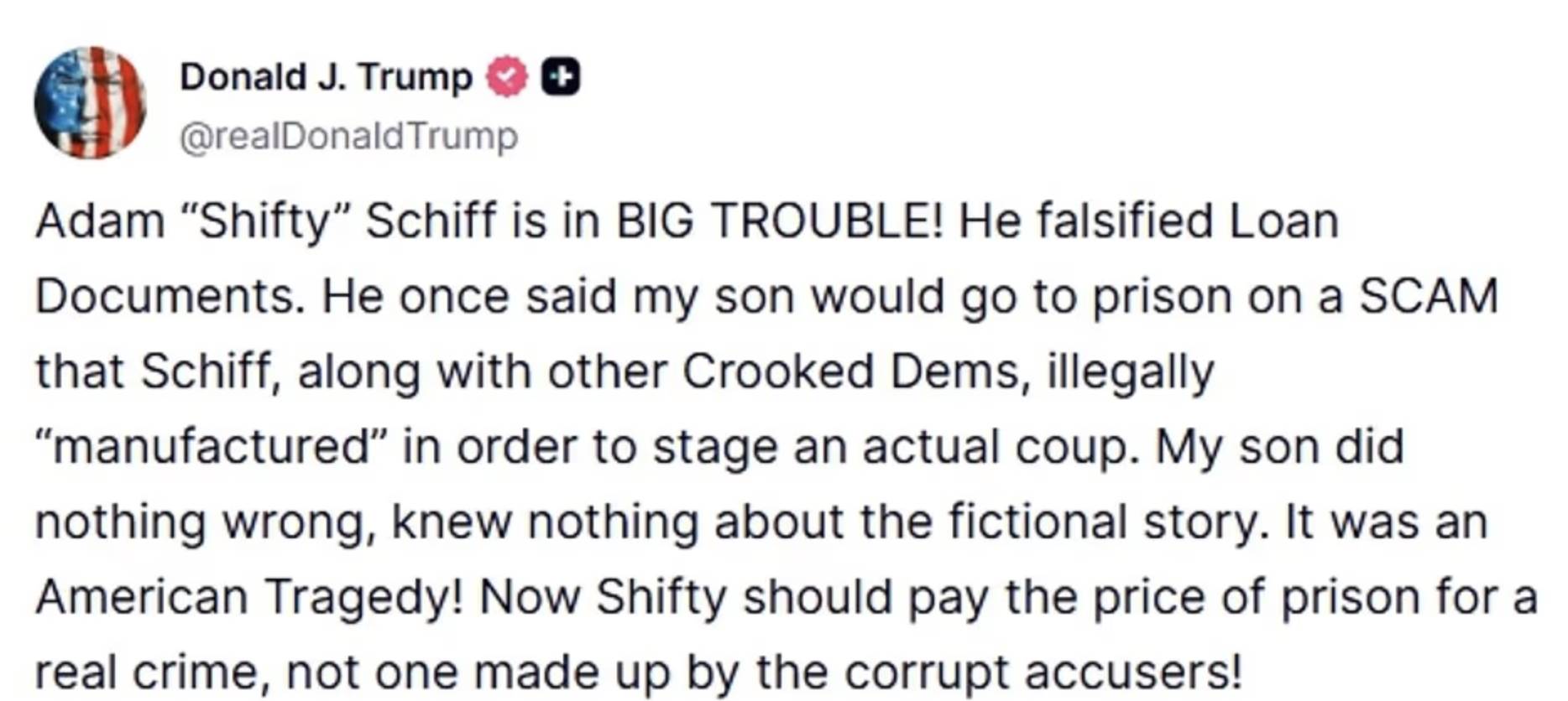 根據《每日郵報》的報導,川普聲稱,希夫在貸款申請中虛報主要居所,涉及「持續存在的抵押貸款詐欺行為」。他寫道:「亞當·『狡猾』·希夫惹大麻煩了。他偽造了貸款文件。」川普還指責希夫曾在2019年擔任眾議院情報委員會主席期間,非法調查其子小唐納德·川普與俄羅斯人士會面的通話記錄,並策動了一場「美國悲劇」。