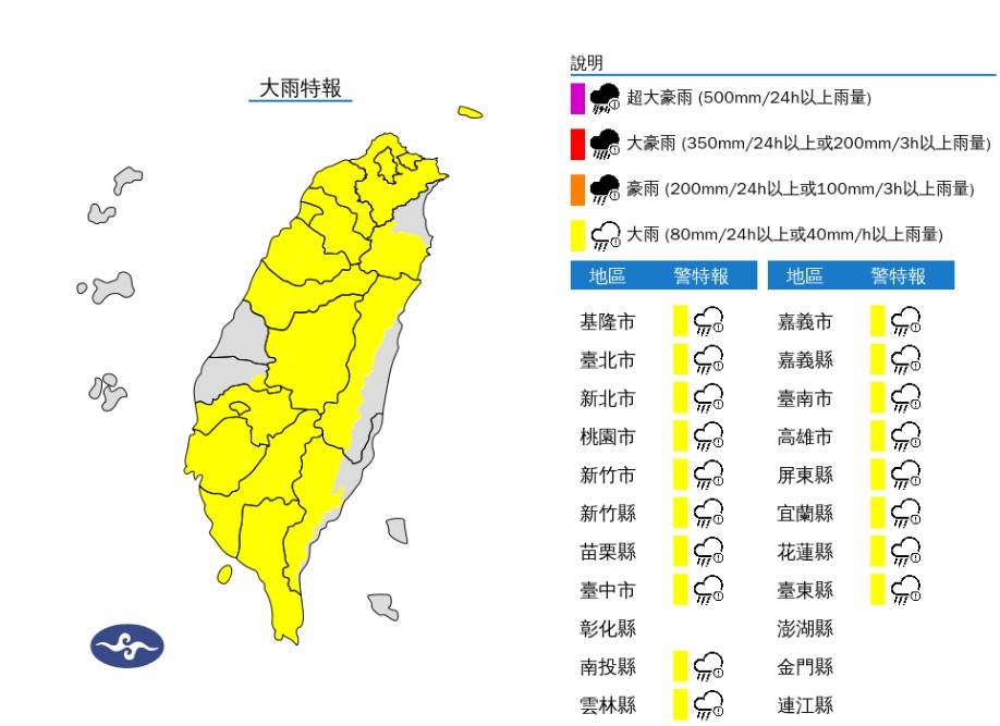 氣象署針對18縣市發布大雨特報。(圖/翻攝自氣象署)