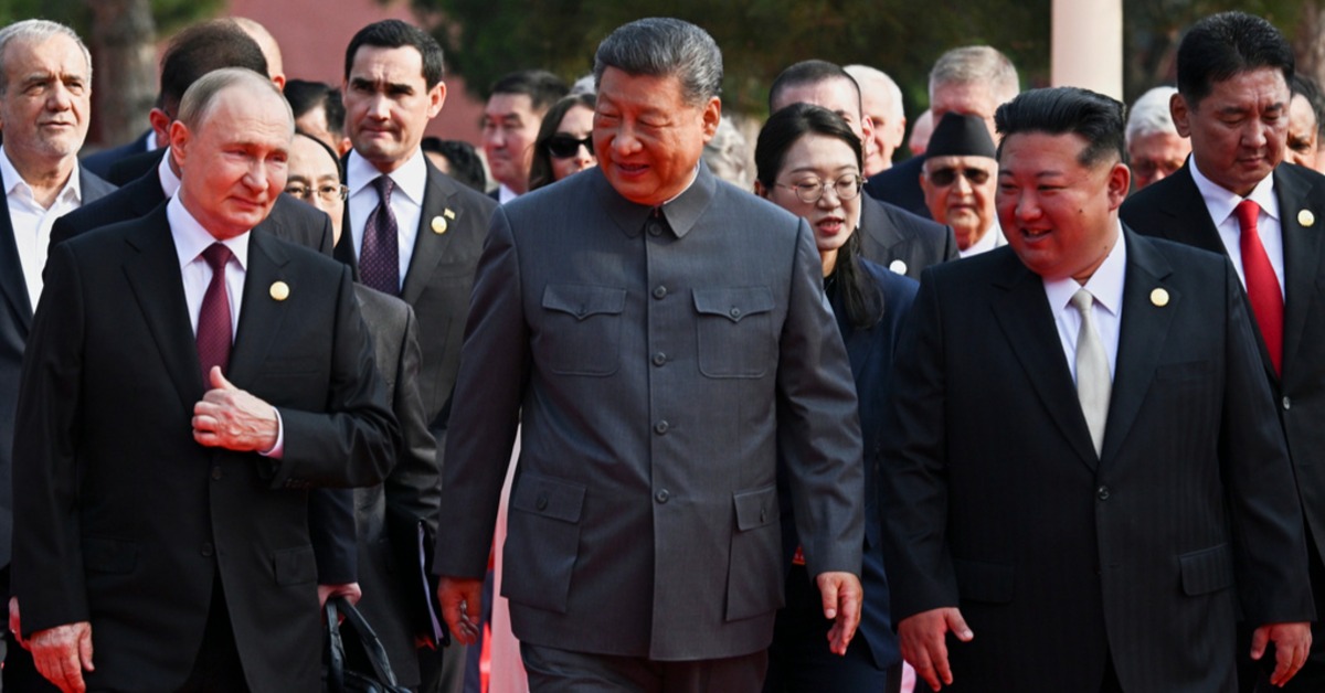 56門禮炮80響,為中國紀念抗戰勝利80周年,揭開序幕。習近平一襲中山裝,與貴賓走上天安門城樓,他的右手邊是俄羅斯總統普丁,左手邊則是北韓領導人金正恩,金正恩還罕見穿上西裝,搭配淺色領帶看起來相當搶眼,典禮期間兩人還頻頻交頭接耳,三人同台被外媒視為「世紀同框」,隱約有向歐美叫陣的意味。