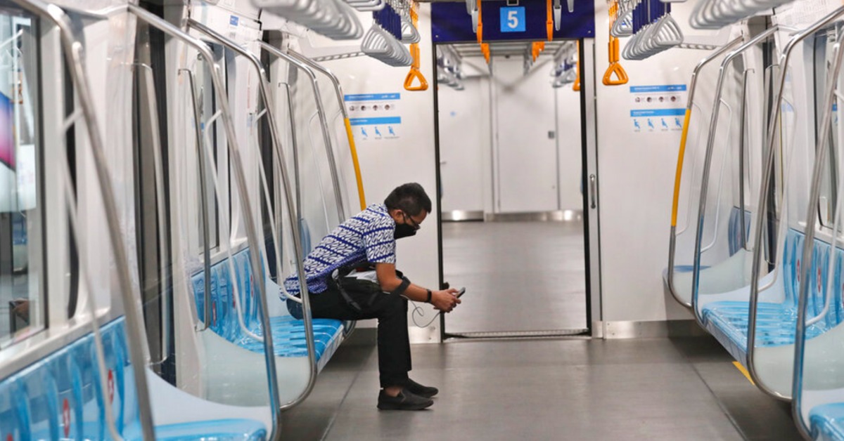 有中國大媽在日本地鐵上,擴音看直播;遭到一名中國男子制止。(圖/美聯社)