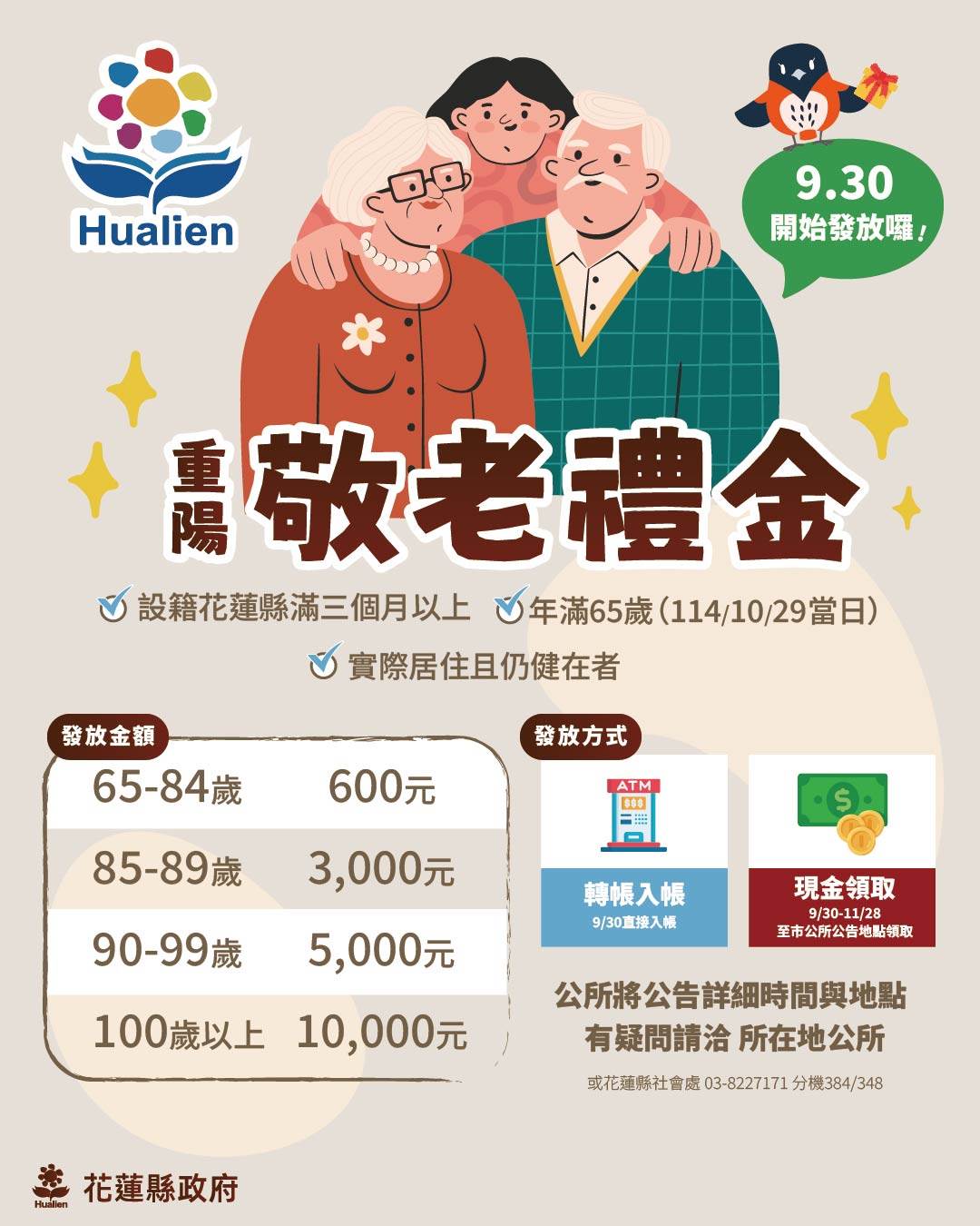 為表達對長者的敬重與關懷,花蓮縣政府宣布,114年重陽節敬老禮金將自9月30日起陸續發放,符合資格的長者預估達6萬7,000人。