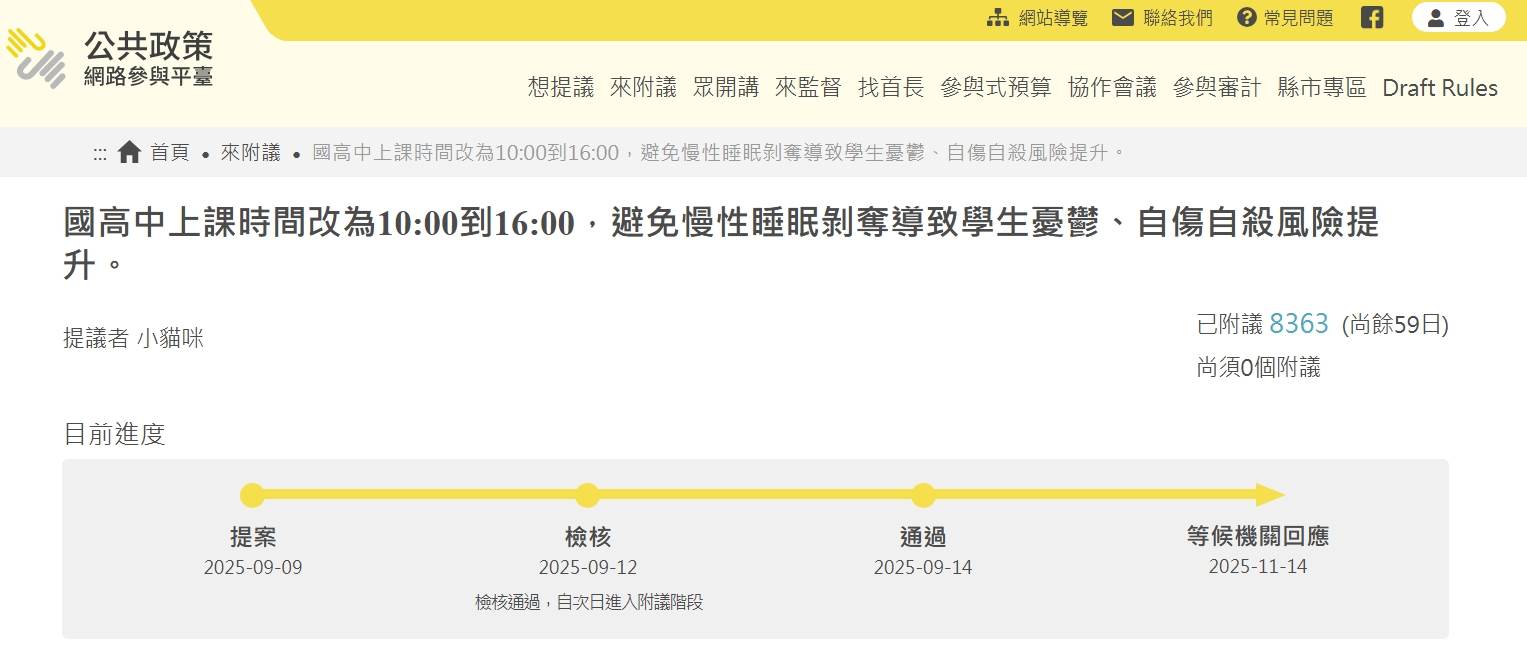 民眾提議國高中早上10點再上課,短短一天已有超過8000人附議。(圖/翻攝自公共政策網路參與平臺)