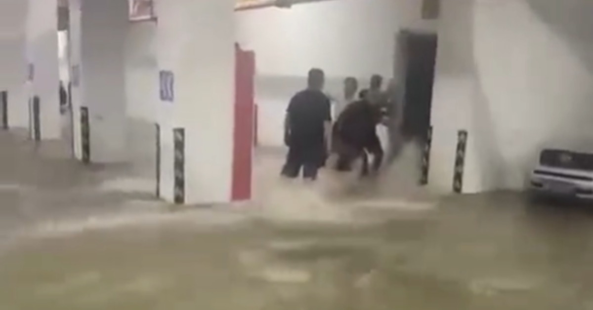 滾滾水流從樓梯不斷宣洩而下,兩三個民眾堵在安全門前,拿著工具試圖要把門給關上,地下室車庫裡已經淹水淹到小腿,不少民眾搶著下樓先將愛車開走,就怕再晚一步車子就開不出去了。