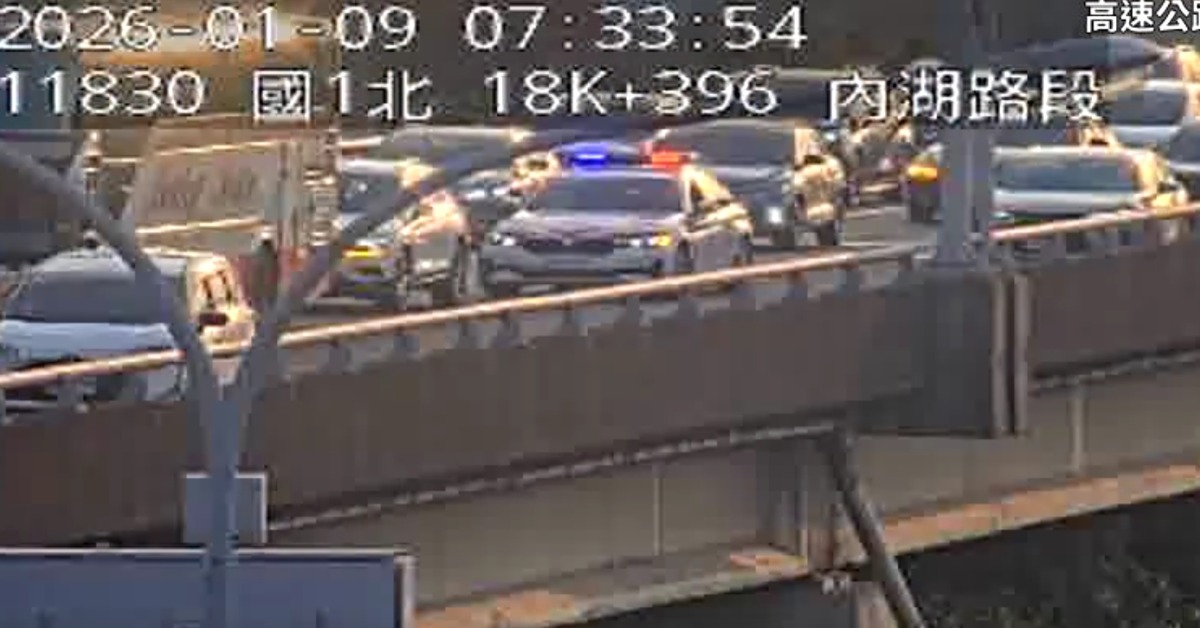 國1高架南向18.2km處汐止端-堤頂路段,今(9日)上午07:28發生自小客車與大客車追撞車禍,一度造成路段回堵。