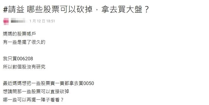 隨著投資行為普及,越來越多人進入市場,其中元大台灣50(0050)以穩健出名,被稱為「國民ETF」,近日就有一名網友表示,母親想把一些股票賣一賣都拿去買0050,好奇「哪一些持股可以直接砍掉」,但網友看到原PO母親的持股後,都紛紛表示「千萬別動」。