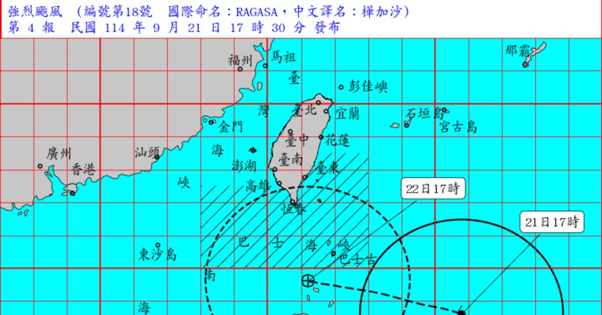 中央氣象署在今(21日)17:30發布樺加沙颱風陸上颱風警報。