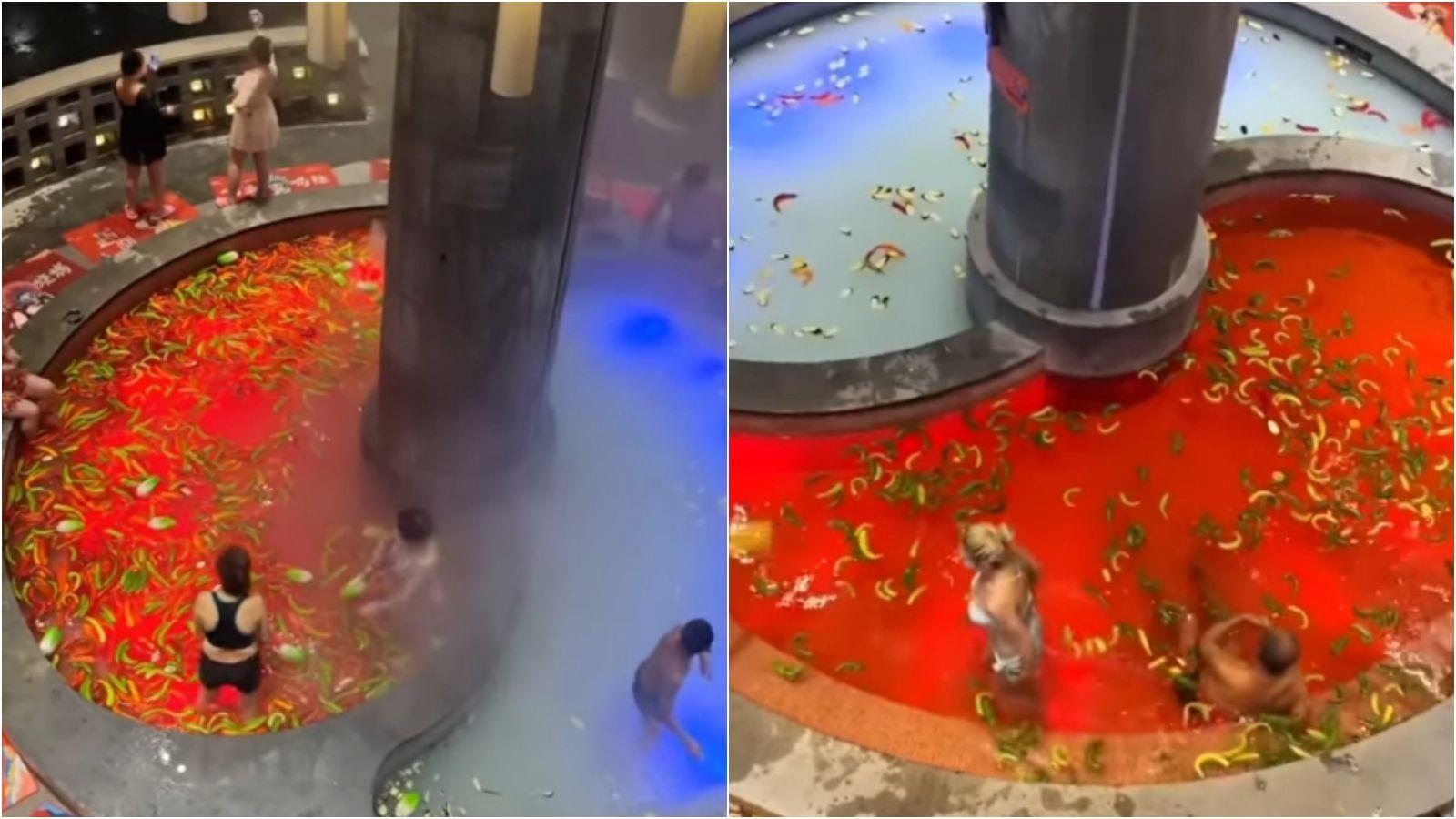 中國哈爾濱某間度假村的澡堂,外型以「鴛鴦鍋」設計打造而成,還在裡面加入各式食材,外觀就像是真的火鍋引發熱議。