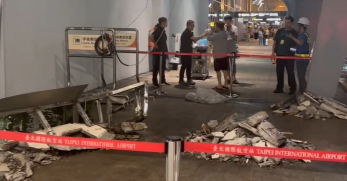 松山機場的機場捷運站2號出口,也就是搭乘國內線要轉乘捷運的地方,在晚間6點左右,天花板突然崩塌。